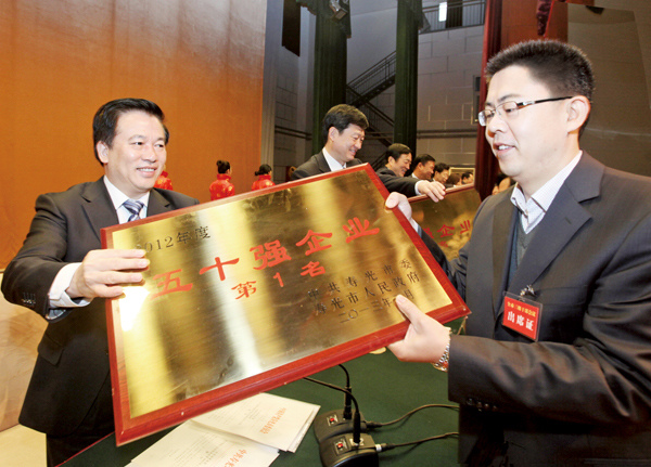 2月26日,全市三級(jí)干部會(huì)議在濰坊科技學(xué)院國(guó)際會(huì)議中心隆重召開(kāi)。會(huì)議表彰獎(jiǎng)勵(lì)了2012年度先進(jìn)單位、先進(jìn)集體和先進(jìn)個(gè)人,我公司位列全市五十強(qiáng)第一名。圖為市委書記孫明亮為我公司頒發(fā)獎(jiǎng)牌。